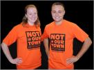 As part of their Not In Our Town campaign, Marshalltown, Iowa, created orange Not In Our Town T-Shirts to unify the movement and allow participants to show their support for the anti-bullying efforts in Marshalltown. The Not In Our Town community dons these shirts at events such as the Aug. 30, 2012 rally at the Marshall County Courthouse, and "orange-out" at a football game in September.