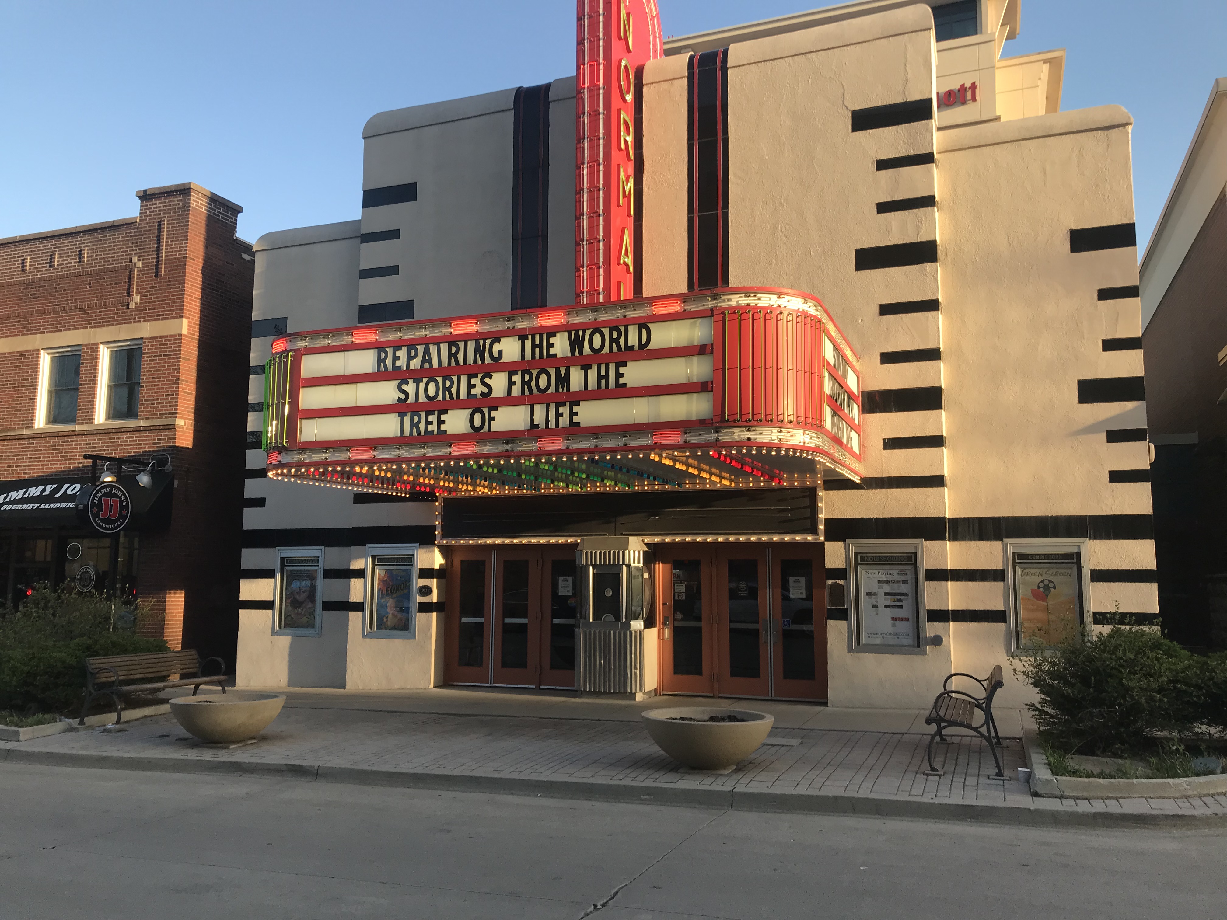 The historic Normal Theatre marquee featuring 'Repairing the World' screening.