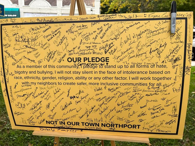 When you arrive in Port Washington, NY, on the North Shore of Long Island, a clear message is presented on a sign. "The Art of Belonging" was the theme of the June 2025 art exhibit at the Northport Library Art Gallery presented by Not In Our Town in partnership with Northport Pridefest. It featured artwork created by young artists in grades K-12, with each piece reflecting what "belonging" means to them. Artists' unique pieces were displayed throughout June to foster a strong sense of community, inclusion, and connection among the artists and all of those who experience the exhibit.