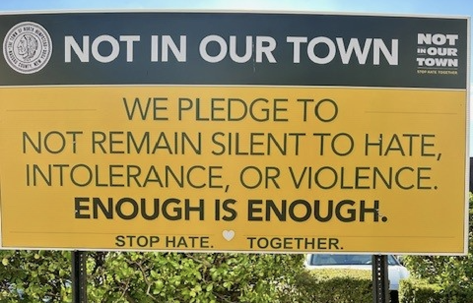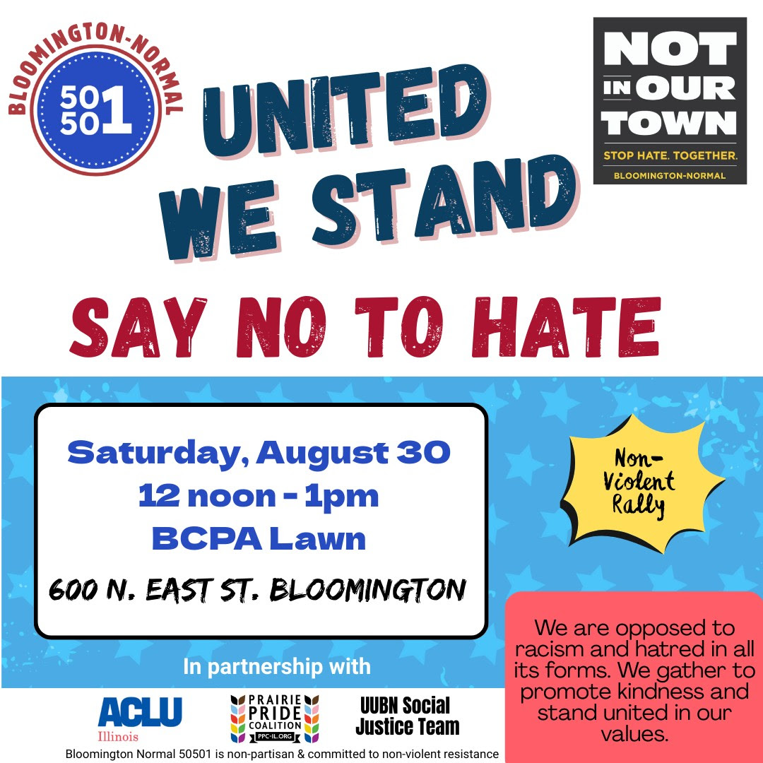 After a hate group posted flyers calling for a neo-Nazi march on August to the local Farmers Market, Not In Our Town Bloomington Normal mobilized to meet with city leaders, and join with a "Say No to Hate " Rally on August 30. The hate group flyer claimed "we have Bloomington's Mayor," which the Mayor said was not true. NIOT leaders and members went to the Bloomington City Council Meeting on Monday, August 25, urging elected leaders and residents to take the NIOT pledge against intolerance and bigotry.