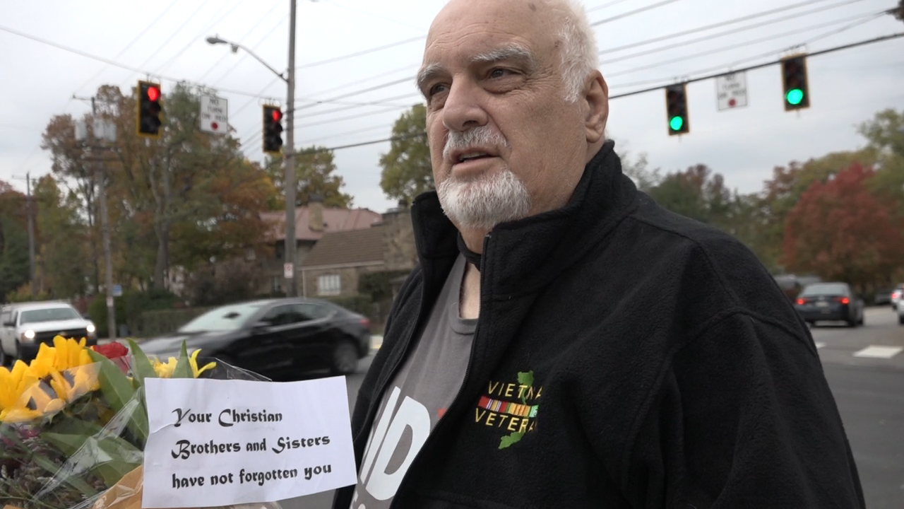 A group of Yeshiva students gathered at the site, as well as a Viet Nam vet whose friend was one of the SWAT team members who helped secure the building while the shooter was still inside, brought a bouquet of flowers and a message, "Your Christian brothers and sisters are with you."