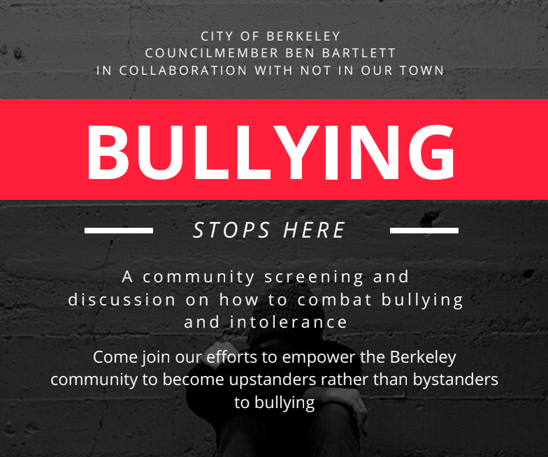 Details: A community screening and discussion on how to combat bullying and intolerance. Come join our efforts to empower the Berkeley community to become upstanders rather than bystanders to bullying.