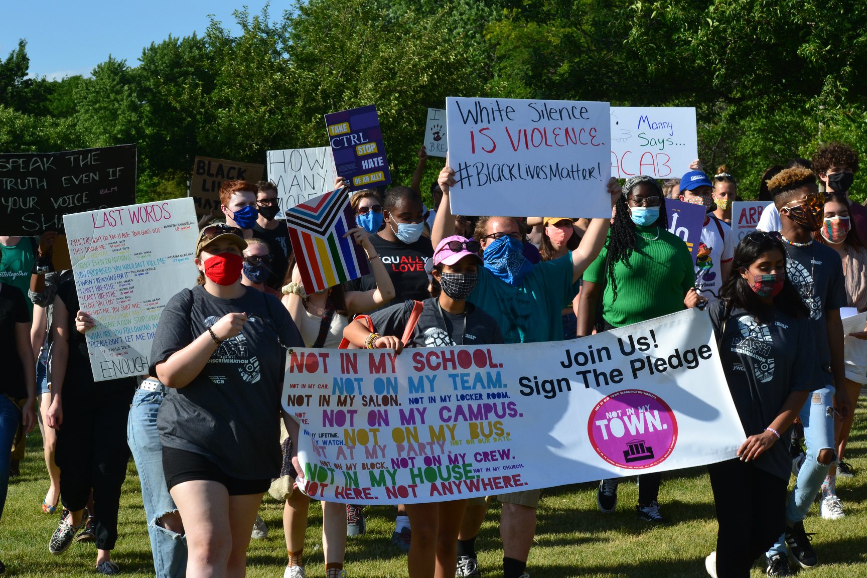 We join the leaders of Not In Our Town: Bloomington-Normal in celebrating the work of the Not In Our Schools chapter of students in Bloomington-Normal, Illinois, who held a march on Monday to stand up for African-American LGBTQ+ fellow citizens. They were so well organized, great speakers and conducted themselves with passion and compassion. Supported by the local chapter of the NAACP, the NIOS march was attended by more than 100 students and members of the community. Here's an article from the local NPR station that provides a little background to the rally and the work that these students are doing in their high school.