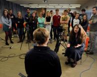Chris Seifert, director of educational services for Montana PBS, teaches students how to conduct an interview during a class at the Billings Public Library. The students will interview people involved in the Not In Our Town movement. Photo Credit: Billings Gazette