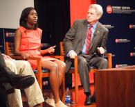 One Mississippi member Taylor McGraw and University of Mississippi Chancellor Dan Jones discuss race relations and the KKK's visit at 'Ole Miss.' Photo Courtesy of Ben Guest.  Last week, the Friends of Mississippi Public Broadcasting organized an advanced screening of Not In Our Town: Class Actions, a 30-minute documentary film which will debut on PBS stations on February 13. The University of Mississippi gained national attention following a divisive debate over a pre-football game chant in the fall of 2009. The fight song's references to segregation and the Confederate South stirred racial tensions among the student body, prompting several student leaders to speak up against hate. The Jan. 31 screening was followed by a panel discussion in the University's Overby Center, led by a group of panelists that inlcuded One Mississippi members Taylor McGraw and Toran Dean, the student leaders who are featured in the film for helping their campus unite after it was targeted for a hate rally by the Ku Klax Klan.