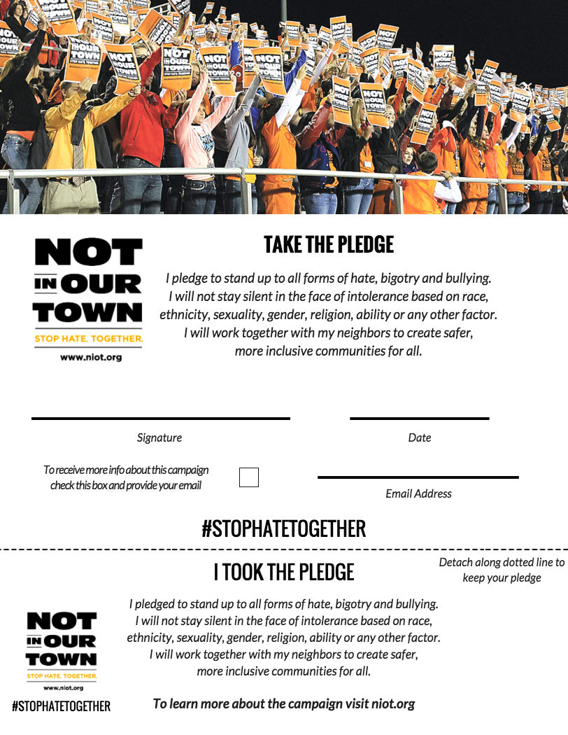 Download the Pledge Encourage friends, family, classmates, neighbors, and coworkers to stand up to hate, racism and bullying. Simply print out the pledge and share! Download: Printable PDF |